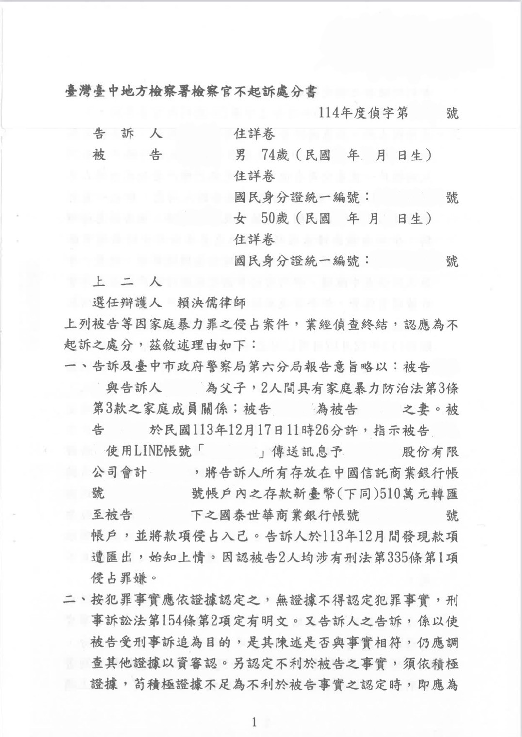 臺中地檢署偵辦一宗家庭成員間的財產糾紛。告訴人指稱,其父與繼母於 2024 年 12 月間,透過 LINE 指示公司會計,將告訴人名下銀行帳戶中的 510 萬元轉匯至父親個人帳戶,涉嫌侵占。