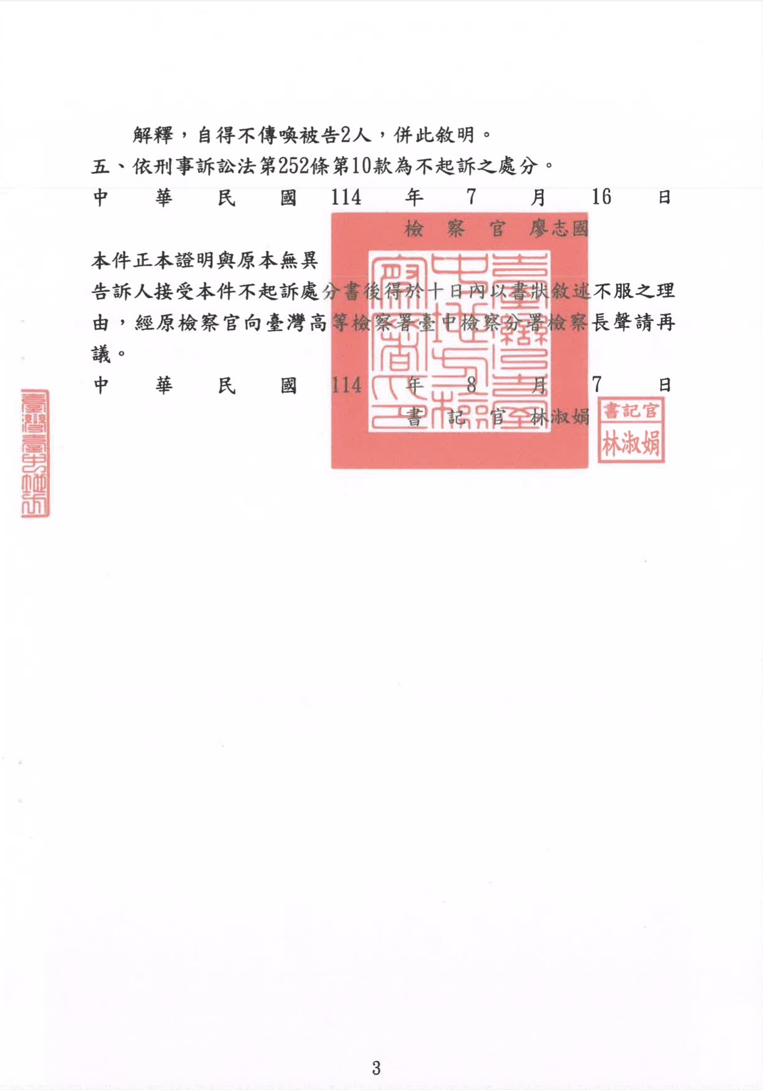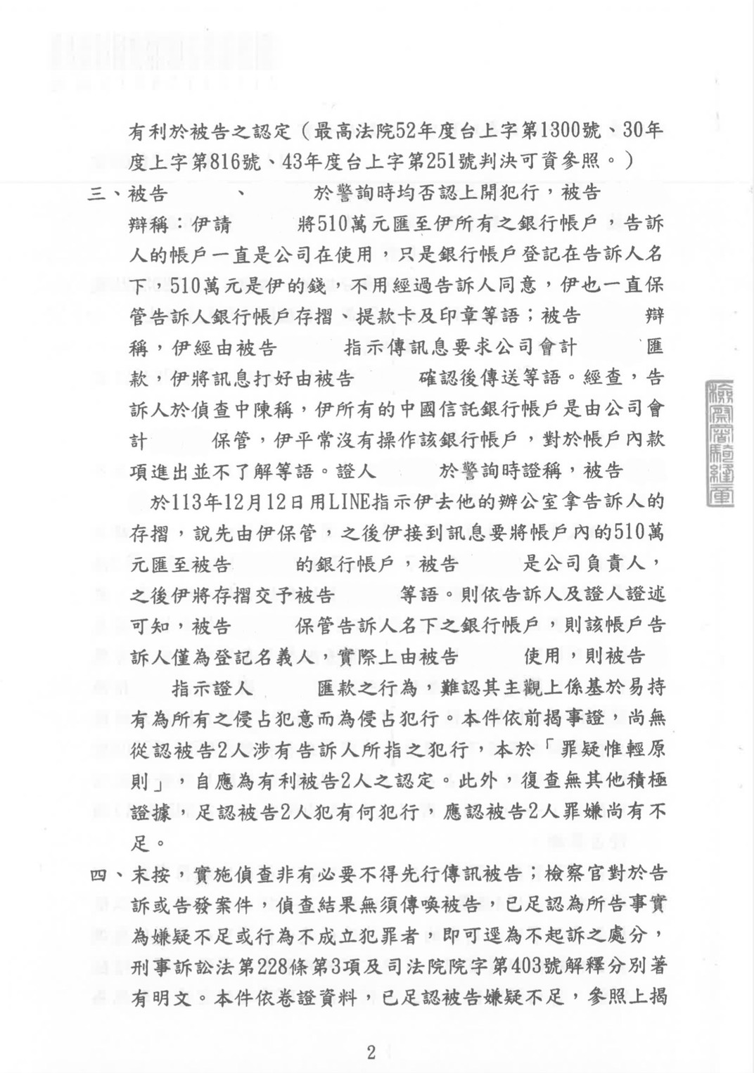 檢察官認為,該帳戶實際由父親管理,並無證據顯示其基於侵占他人財物之犯意,欠缺積極證據支持指控。依「罪疑惟輕」原則及刑事訴訟法第252條第10款,認定嫌疑不足,對兩名被告為不起訴處分。