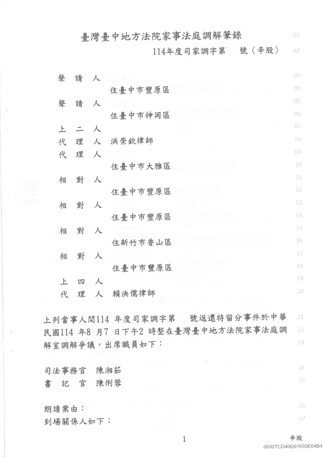 臺中地院家事法庭於 2024 年 8 月 7 日,就家族間返還特留分與遺產分割爭議進行調解。聲請人由律師代理出席,相對人亦由律師代理到場。