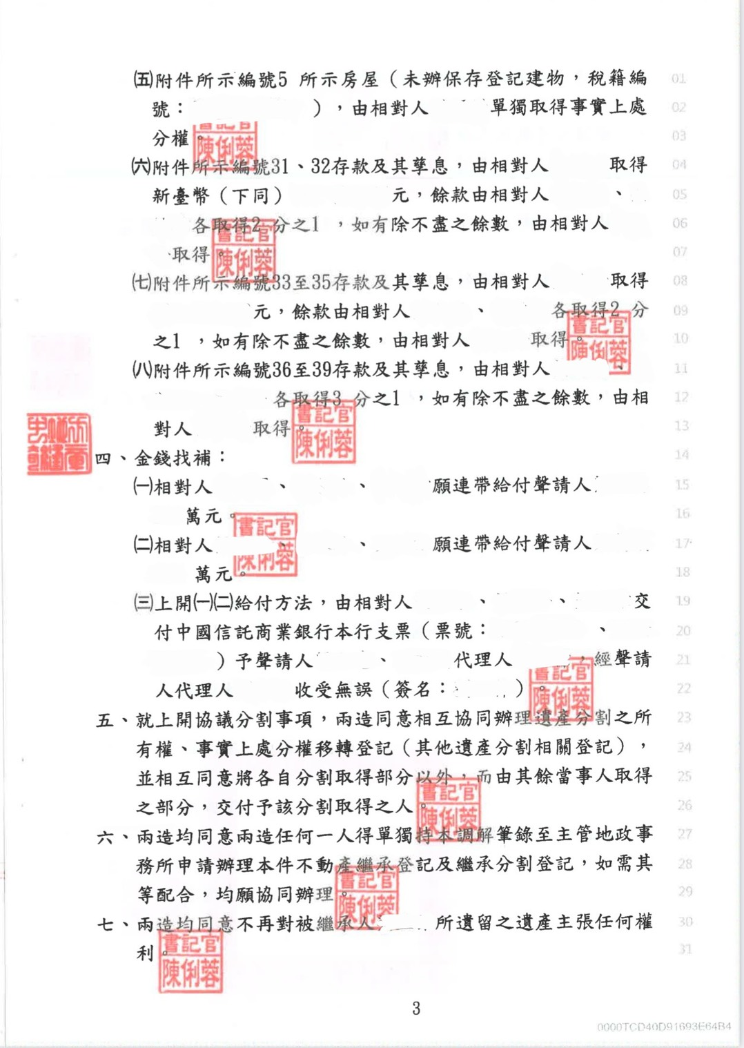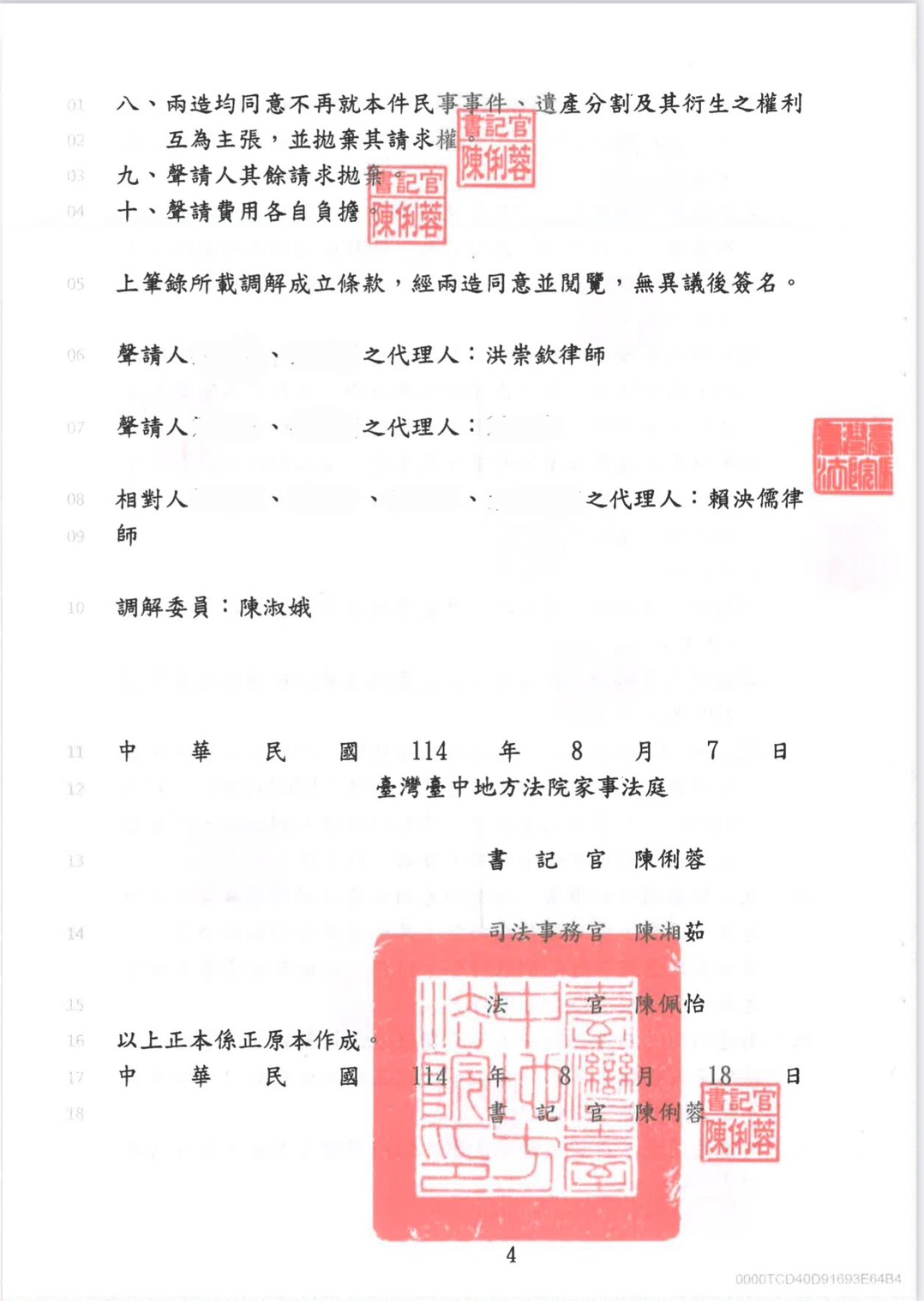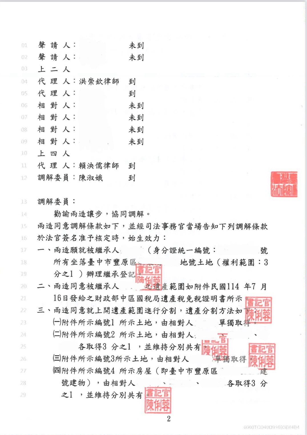 雙方同意以調解方式解決,確定被繼承人遺產範圍,以國稅局免稅證明書所列為準,並就相關土地、房屋及存款進行分割:特定土地及房屋由部分相對人單獨取得或分別共有,存款依比例分配。